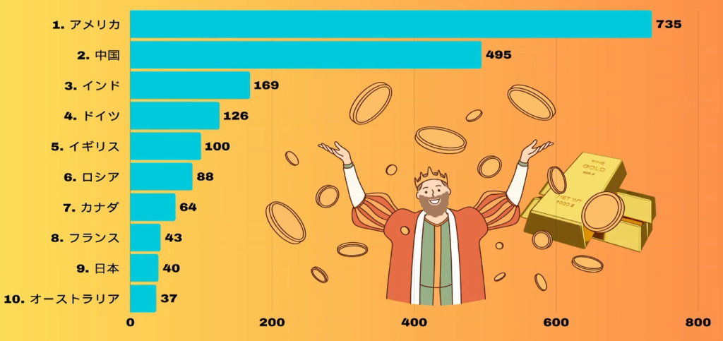 アメリカと中国が圧倒的な存在感を示していますが、日本も約40人の超富豪を輩出しており、アジア諸国の中では一定の存在感を放っています。今後はスタートアップ支援やオープンイノベーションの加速によって、この数字がどこまで伸びるかが注目されます。